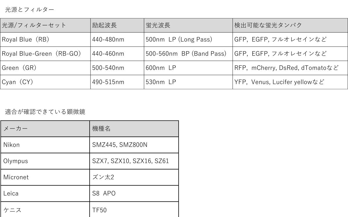 お手持ちの実体頭微鏡に取り付けるだけで、GFP, YFP,RFP などの蛍光タンパク等を蛍光実体頭微鏡と同様に検出・観察することができます。 ボタン1つで励起光を変更可能で、フィルターの着脱も簡単なので、より手軽に蛍光観察を行うことができます。 OLFASアダプターは、対物レンズの直径が最大68mmの実体顕微鏡に取り付けることができます。