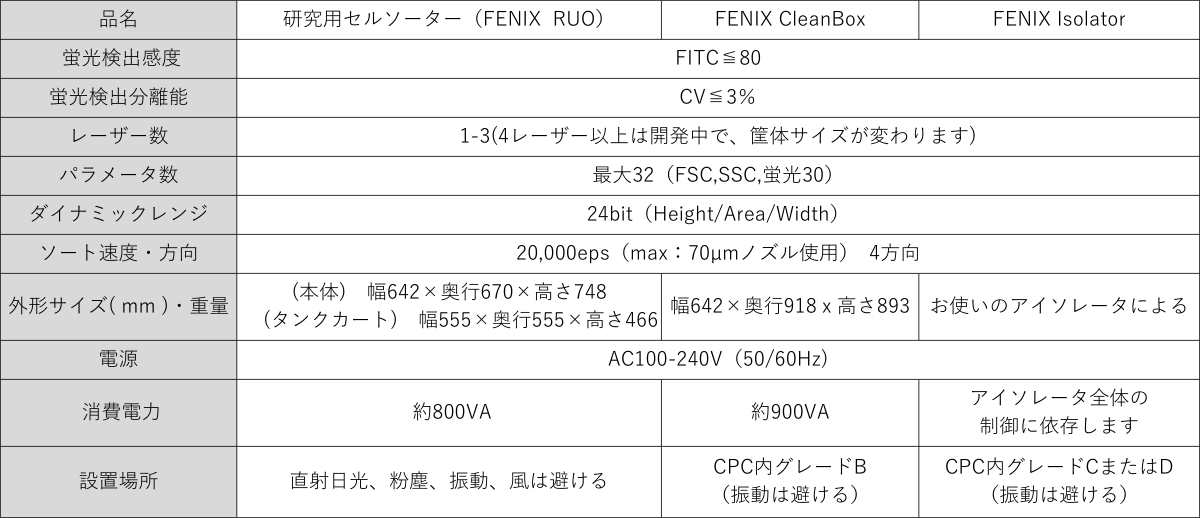 <特徴> 1.ソーター内部のエアロゾル汚染を除染します FENIXでは、除染エリアをソート部に限定し、無配線かつ耐除染剤素材を使用しています。 ソーターにある電子部品・電子回路は気密隔離で保護、同様に光学部品や光学機器もガラス封止隔離を実現しているため、除染剤による錆やダメージを気にすることなく、ソーター内部の除染を可能としています。 2.全ての細胞接触部が交換可能で、滅菌したものを毎回使用することができます FENIXでは、細胞のキャリーオーバーをなくすために、細胞接触部の部品をすべて交換できるようにしました。 部品はいずれもγ線による滅菌が完了したものをお届けします。 これにより、前の患者の細胞が交差することなく、常に無菌状態を保つことができます。 3.光軸・ソート調整はすべて自動調整が可能です 細胞接触部の部品を交換するたびに、光軸やソートの調整をすべて自動で行います。 交換のたびに調整を行う手間を省けるだけではなく、状況に応じて最適なコンディション調整が行われるようになるため、ソーティングの精度が上がり、良質な細胞の取得が可能となります。