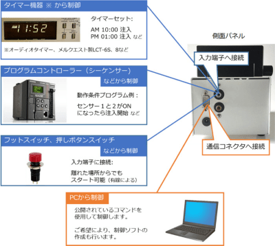 ・100mlのシリンジ2本を同時に押し出すことができるハイパワーモーターを搭載。 ・大口径シリンジに対応。 ・小型ながら高剛性。負荷に強い機構です。 ・フットスイッチやタイマー機器、PCからの制御が可能です。 ・プログラムモードなど各種モードに対応。
