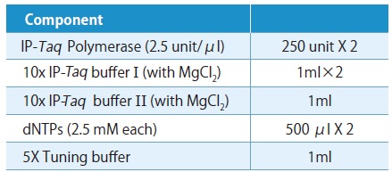 【付属試薬】 LaboPass™ IP-Taq DNA Polymerase には、PCR 収量を向上させるために最適化されたバッファーが付属しています。 ・10X IP-Taq buffer I and II (with MgCl2) LaboPass™ IP-Taq DNA Polymerase には、塩組成が異なる 2種類の反応バッファーが付属しています。通常、バッファー I はほとんどの PCR 反応でうまく機能します。バッファー I を使用しても PCR 産物が満足のいくものでない場合 ( 非特異的、産物がほとんどまたはまったくない場合) は、バッファー II の使用をお試しください。 ・5X Tuning buffer チューニングバッファーは、GC 含有量が高い、または二次構造が安定しているなどの問題のあるテンプレートDNA を含む反応でのPCR 効率を向上させることができるため、複雑で長いターゲット配列を増幅するのに有利です。