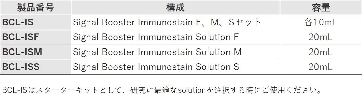 Signal Booster Immunostainには、以下の3種類の溶液があります。 Solution F:バックグランドをより低下させるように設計された組成です。良好な抗体を用いて微細構造を見る場合にお勧めします。 Solution M:FとSの中間の性質を有した組成です。最初に試す場合に利用すると便利です。 Solution S:より強いシグナルを得るように設計された組成です。多少バックグランドが高くても染色像を見たい場合にお勧めします。 (ご注意:各溶液の性質は一般的性質を示したものであり、使用抗体の特性によって反応は異なります。使用する際には3種を試して、適切な溶液を選択してご利用ください。)