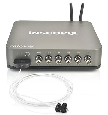 nVoke は上記の nVista in-vivo イメージングシステムにオプトジェネティクス光刺激の機能を追加したものです。 すなわち、 青励起光 (455nm) を照射して緑蛍光 (515nm) を測定し、 並行して任意のタイミングで赤色の光刺激 (620nm±30nm) を同じ位置に照射することが可能です。 ハロロドプシン等を用いた神経活動の抑制制御、 および ChrimsonR 等を用いた神経活動の興奮制御が行なえます。