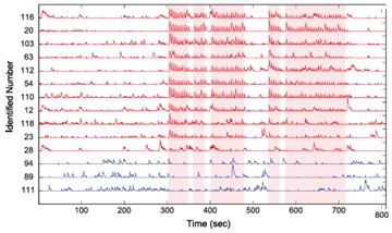 1細胞ごとの蛍光強度トレース。オレンジ色で示した範囲で光刺激が照射された。