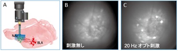 A. 側坐核ニューロンにGCaMPを、BLAニューロンにChrimsonRを発現させ、側坐核にグリンレンズを埋込。 B, C. 側坐核ニューロンのGCaMPイメージング像。20Hzの赤色オプトジェネティクス刺激を与えるとGCaMPのシグナルが増強した。