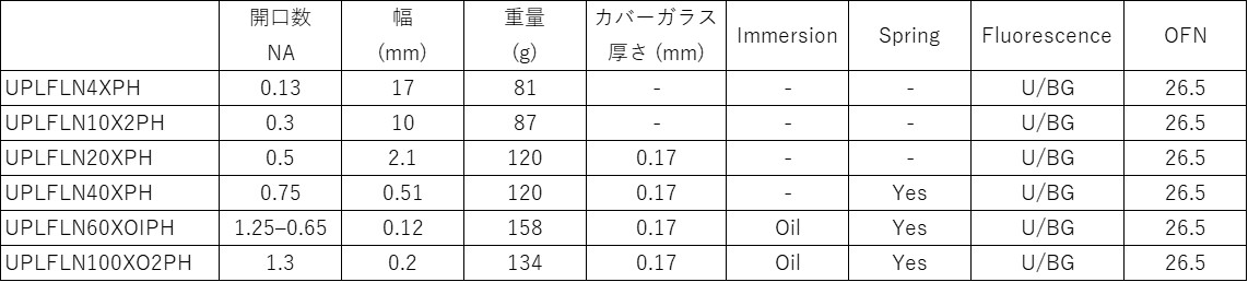 UPLFLN-PH対物レンズは、高いS/N比、分解能、コントラストを持ち、位相差観測に特に有効です。 これらの対物レンズは、紫から近赤外領域までの画像でflを表示します。