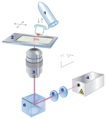 1 MMIアイソレーションキャップ 2 MMIメンブレンスライド 3 位相差対物レンズ 4 UV固体レーザー 5 フォーカシングレンズ 6 偏光ビームコンバイナー