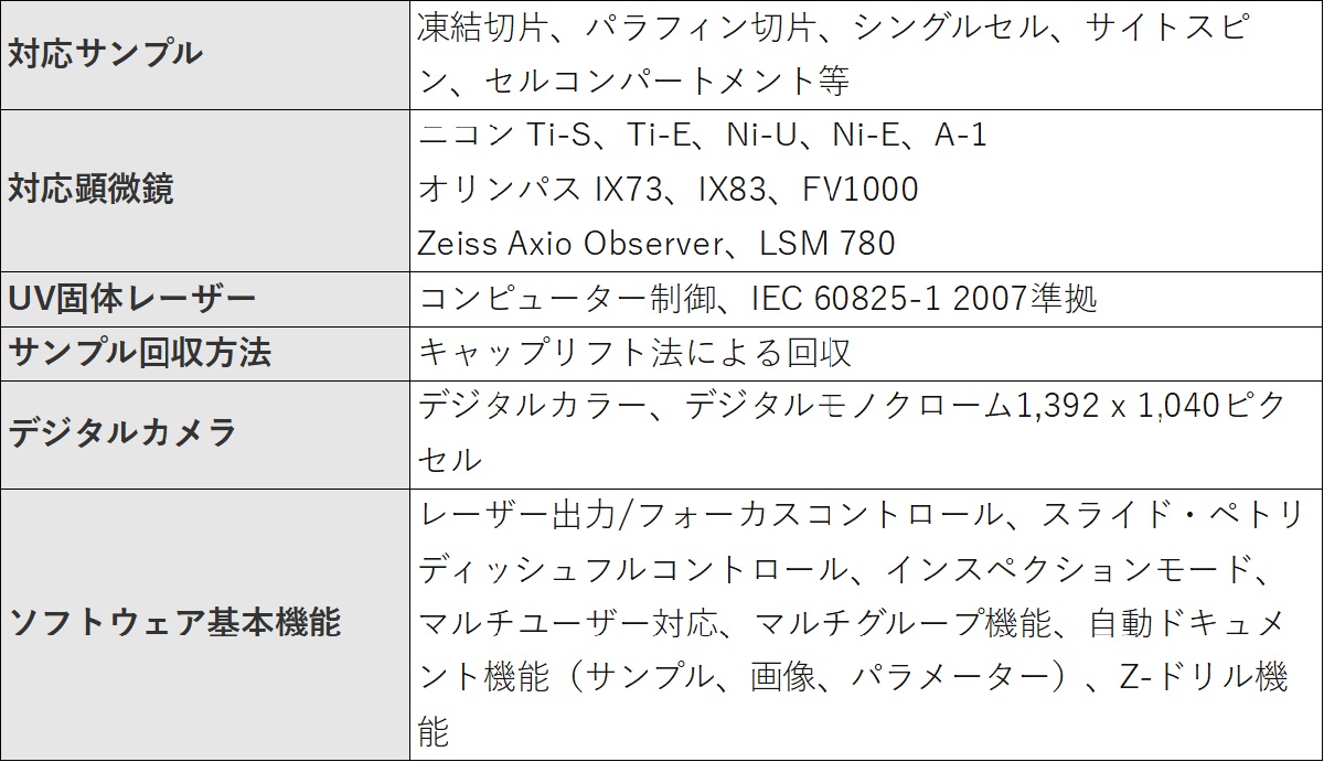 〇無菌操作でのサンプルの切り出し サンプルは、薄膜とガラスの間に挟まれているため、外気にさらされることはありません。これにより、安全な作業環境とサンプルの保全を確保することができます。 〇採集効率の最大化 分離用キャップを用いたサンプルの採集は、採集効率が最大化され、サンプルダメージは最小限にとどめることができます。 〇コンタミネーションの起こらない採取 MMI 分離キャップは薄膜だけに接触しているので、組織に直接接触することはありません。 〇薄くて美しい切断技術 レーザーマイクロダイセクションシステムは、超精密で高いパルス率、低消費電力に固定されたUV レーザーを用いることで、薄くきれいな切断技術を可能にしています。0.3μm の幅で、正確かつ精密な切断が可能です。 〇ポジティブなサンプル検査 レーザーによる切断後に確実にサンプル収集が行われます。 採取ターゲット領域の分離は、スライド上の相対的に同じ場所から行います。サンプルの形態は100% 保存され、周辺組織へのダメージも発生しません。これにより簡便に再現性の高い結果を得ることができ、高い可監査性と正確で定量的な結果を得られます。 〇目標位置の設定(Predefined Target Positioning :PTP) PTP という特許を持つ機能によって、正確にあらかじめ位置を設定し、コンタミネーションなく視覚的に制御してキャップ上に細胞を採取することが可能になります。 PTP により最大限の細胞数がチューブに回収され、PTP により位置決定した後に切断されたサンプルは純度が高く、検査にも必要な機能であると言えます。 まず、試料全体の概要が示されます。次に、画像を見ながら標的細胞の選択を行います。このステップは、MMI CellExplorer ソフトウェアを使用して、完全に自動化することもできます。PTP モードに切り替えると、キャップの中心から螺旋状に細胞が切り出されキャップに回収されます。 〇MMI MultiCap とMMI MultiSlide 最大3 つのスライドへと単離できるMMI MultiSlide と、同様に最大8 個のキャップに単離できるMMI Multicap があります。これらは、回収容器の付け替えを何度も行わなくてよいので、作業スピードが重要であるRNA 抽出を伴う細胞ワークフローに向いています。 〇自動記録 多様な組織切断を可能にする、唯一のレーザーマイクロダイセクションです。自動記録機能により、切断部分と細胞回収位置の画像と、日時、メソッド詳細について記録します。 〇連続切片 RNA 回収量を最大にするためには、組織染色を最小限に抑える必要があります。そこで、連続切片のうち、染色した切片の標的細胞の位置を参照して、未染色の切片においても目的とする細胞範囲を検出し切り出して単離することができるのです。 〇Z 軸ドリル Z 軸ドリル機能を使うことによって、高出力レーザーを使用せずに厚い組織や生組織を切ることができます。 なるべく良い状態でサンプルを維持するために過度のレーザーパワーの使用を最小限にし、その後の分析に使いやすくするために、Z 軸方向に対しレーザーの焦点を再度合わせます。代替の高出力レーザーは、歯、骨、または法医学用サンプルを採取した粘着テープを切断するときに使用します。