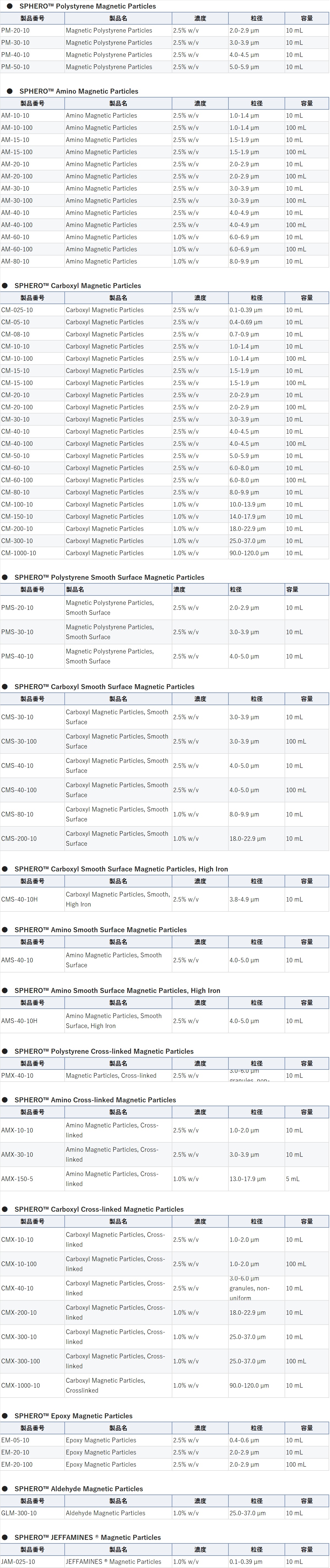 Spherotechの常磁性粒子は均一なサイズのポリスチレンコア粒子にマグネタイト及びポリスチレンをコーティングすることで作成されています。その結果球状で均一な大きさの常磁性粒子となっています。マグネタイトの含有量は通常、1umの粒子で、10-15%程度となっています。常磁性粒子は懸濁液から磁気的に容易に分離でき、マグネットから取り外されると非磁性粒子となり、強い磁場に繰り返しさらしても検出可能な磁気は帯びません。この製品は細胞分離、アフィニティー生成、DNAプローブアッセイ、磁性粒子EIAなどに使用可能です。