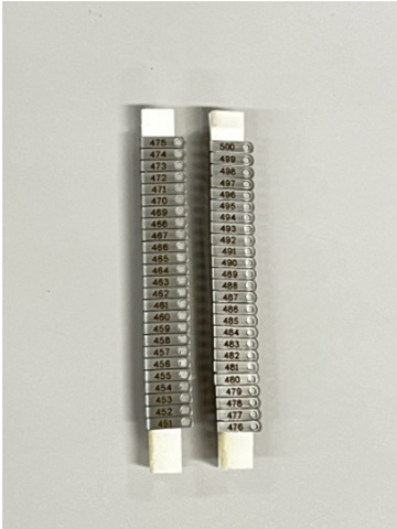 材 質:モネル合金xe2x9cxb3 (レーザーマーキング) サイズ:W2.5 × L6mm 番 号:No.1〜1000 (Aセット) No.1〜500 (Bセット) 英数文字5桁までの特注品製作可能、特注品は1000個以上で承ります。 納期、価格はお問い合わせください。
