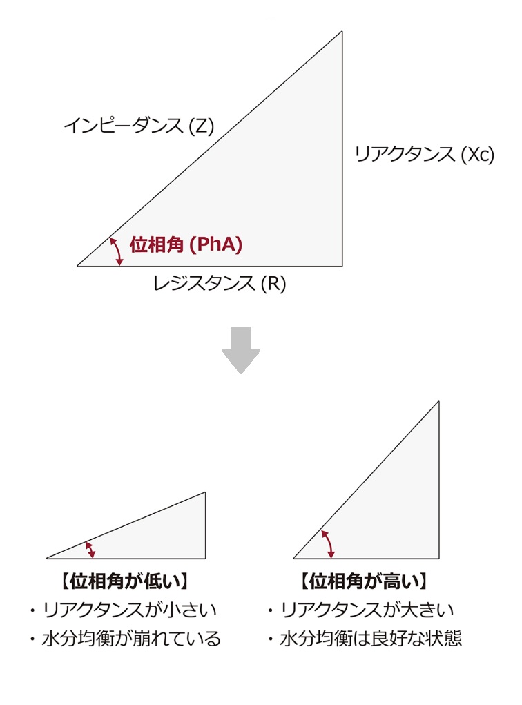 【インピーダンスの概念】 インピーダンスは、レジスタンスとリアクタンスのベクトルの和であり、交流電流の流れを邪魔する全ての要素の総称です。レジスタンスとリアクタンスとは三角関数の関係を持つので、インピーダンスとリアクタンスが分かれば下図赤線の角度が計算できます。この角度を位相角(Phase angle)と言い、細胞膜の完成度及び細胞内・外水分の均衡度を評価する指標として使用されます。