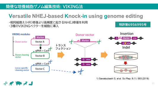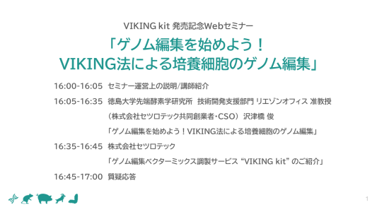 VIKING 法は簡便で効率的なゲノム編集法として注目されています。本セミナーでは、培養細胞のゲノム編集方法について理解を深めて頂くため、VIKING 法の開発者本人が、発明の経緯から原理・メリットについて、実際の研究事例も紹介しながら講演します。また、セツロテックの新サービス “VIKING kit” は、ゲノム編集初心者でもご自身の研究室で手軽に培養細胞のゲノム編集を始められる、ゲノム編集ベクターミックス調製サービスで、研究者は迅速かつ効率的に実験を進められます。本セミナーは、ゲノム編集に興味のある方やVIKING 法を活用した研究を始めたい方にとって、貴重な機会となるでしょう。ぜひ参加し、VIKING 法の可能性と応用について学び、新たな研究への第一歩を踏み出しましょう。