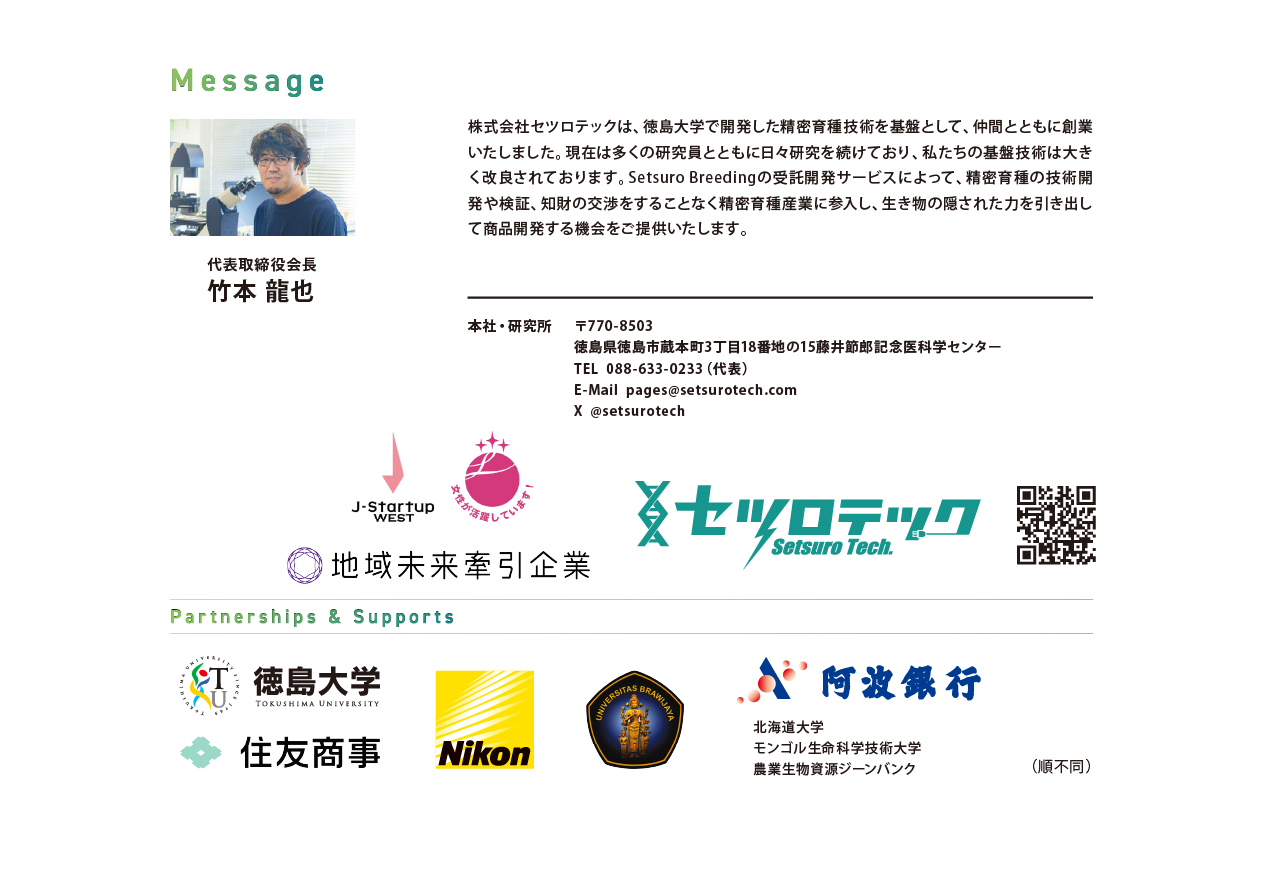 資料をご希望の方はフォームに入力のうえ送信してください。送信完了画面または登録アドレスに届くメールからダウンロードできます。 この資料でわかること Setsuro Breedingの概要 Setsuro Breedingの利用イメージ セツロテックの会社概要・特徴 件名* お名前* 施設名(会社・大学など)* 部署名・学部名など* 役職名* -選択してください- 社長・役員 本部長・部長 次長・副部長 課長 係長・主任 社員・職員 その他 電話番号* e-mailアドレス* お問い合わせ内容 個人情報の取り扱い* 個人情報の取扱いに同意します。 個人情報の取り扱い 弊社へのお問い合わせのきっかけを教えてください。* 学会・展示会 Webで検索して セツロテックメールマガジン 弊社Webセミナーの視聴 弊社営業担当者の訪問 弊社よりお電話でご案内 知人の紹介 代理店からの紹介 協議会からの紹介 ピッチ/マッチングイベント その他
