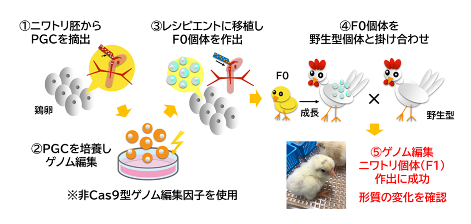 多くの動物では、1細胞の段階にある受精卵においてゲノム編集がなされており、その受精卵(1細胞)が発生してつくられる個体がゲノム編集個体となります。しかしながらニワトリの場合、「メスニワトリから産み落とされた卵」はすでに2-6万個の細胞になっており、ゲノム編集に使うことができません。そこで、始原生殖細胞においてゲノム編集を行い、その始原生殖細胞を代理母に移植(血管に注射)する方法が採られています。