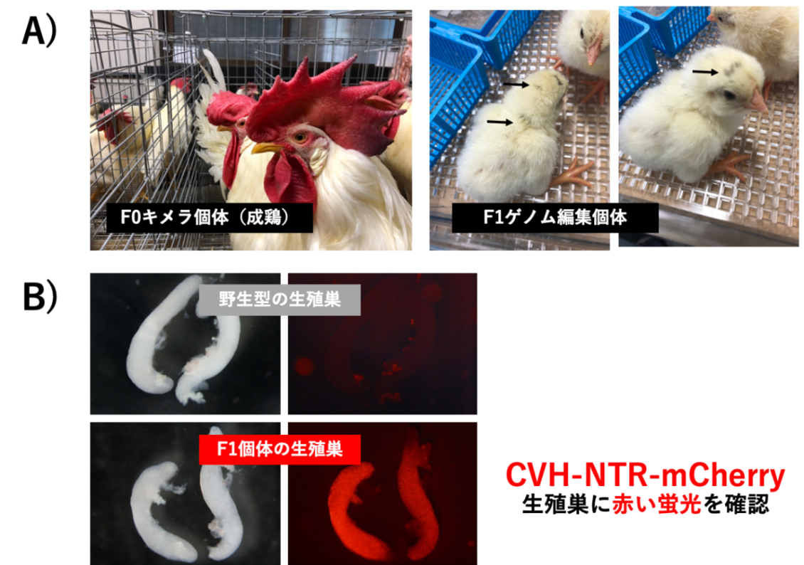 ニワトリ胚からPGCを摘出(上図①)し、体外培養後、mCherry遺伝子とNTR遺伝子とをPGC特異的に発現するCVH遺伝子座に挿入しました(CVH-NTR-mCherry)(非Cas9型ゲノム編集因子を使用、上図②)。得られたゲノム編集PGCを、代理母ニワトリに移植しました(上図③)。この代理母ニワトリの生殖巣(精巣・卵巣)には、移植されたゲノム編集PGCが定着します。成鶏になったニワトリ(F0 個体)を野生型ニワトリとかけ合わせ(上図④)、ゲノム編集ニワトリ個体(F1)を誕生させることに成功しました(上図⑤、下図A)。